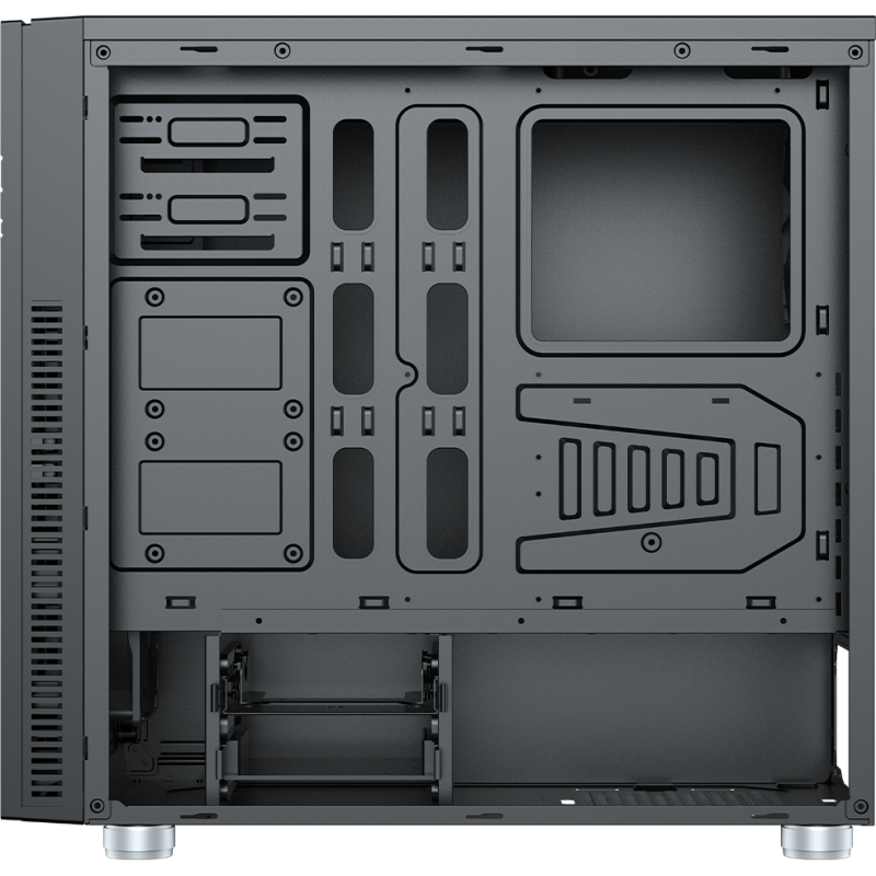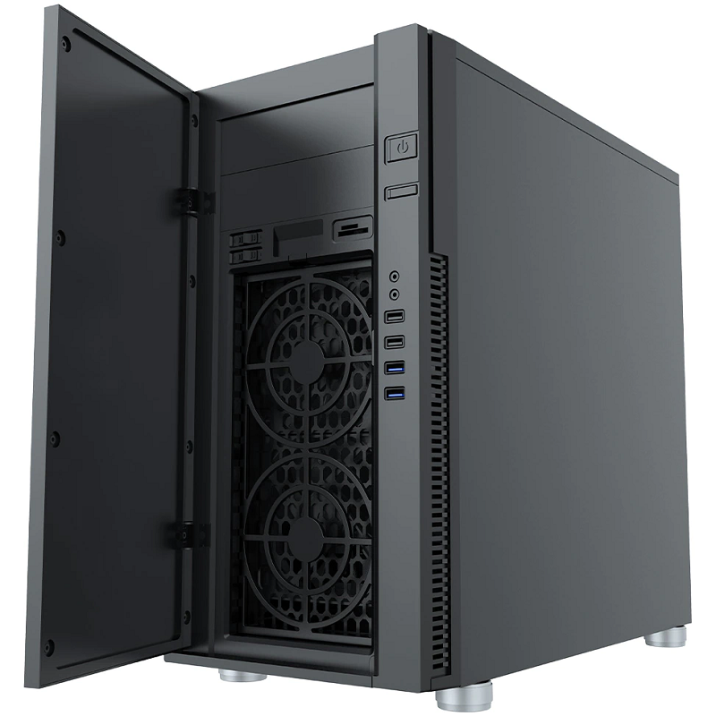 – Caractéristiques spéciales : panneau avant avec charnière, matériau insonorisant, lecteur de carte SD+ MicroSD, régulateur de vitesse des ventilateurs, prises de gestion des câbles