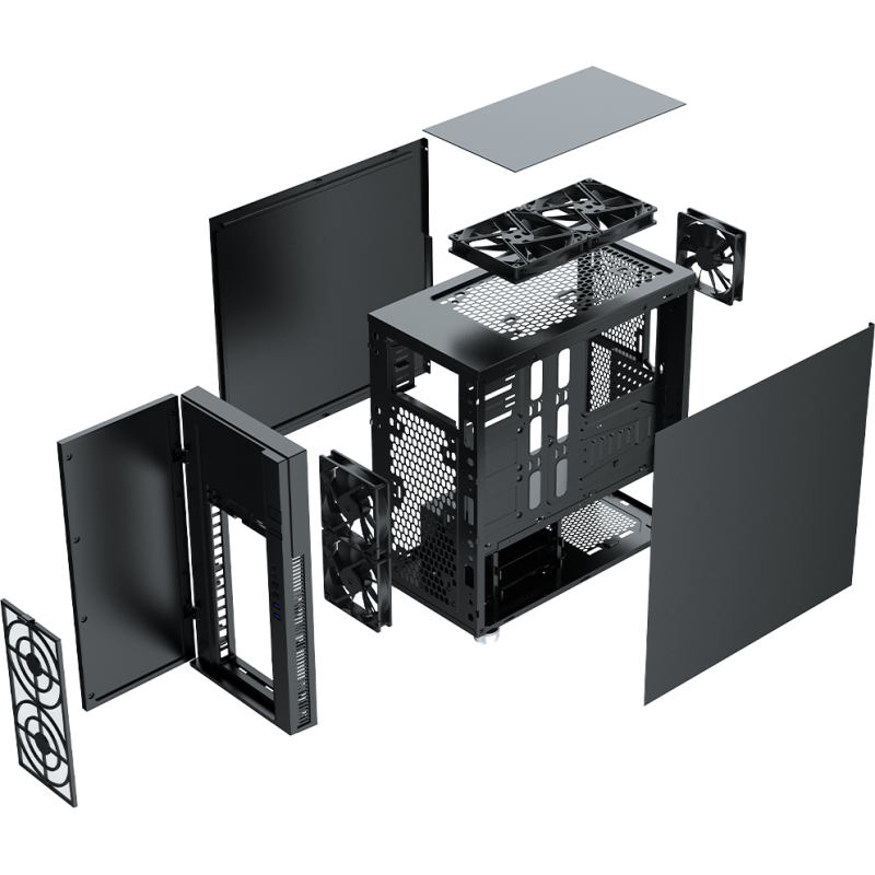 – Ventilateurs pris en charge : 5 pièces – Arrière 1x 120 mm, Avant 2x 120 mm, Haut 2x 120/140 mm