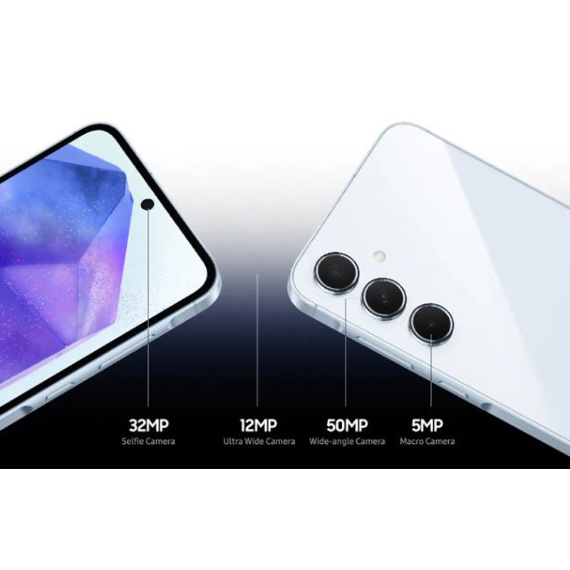 Le Smartphone Samsung A55 à l’arrière contient trois caméras comprenant une caméra principale de 50 mégapixels , un appareil photo 12 mégapixels et deux appareilles photos de 5méga pixels .Il dispose aussi d’une seule caméra frontale pour les selfies, avec un capteur de 32 méga pixels